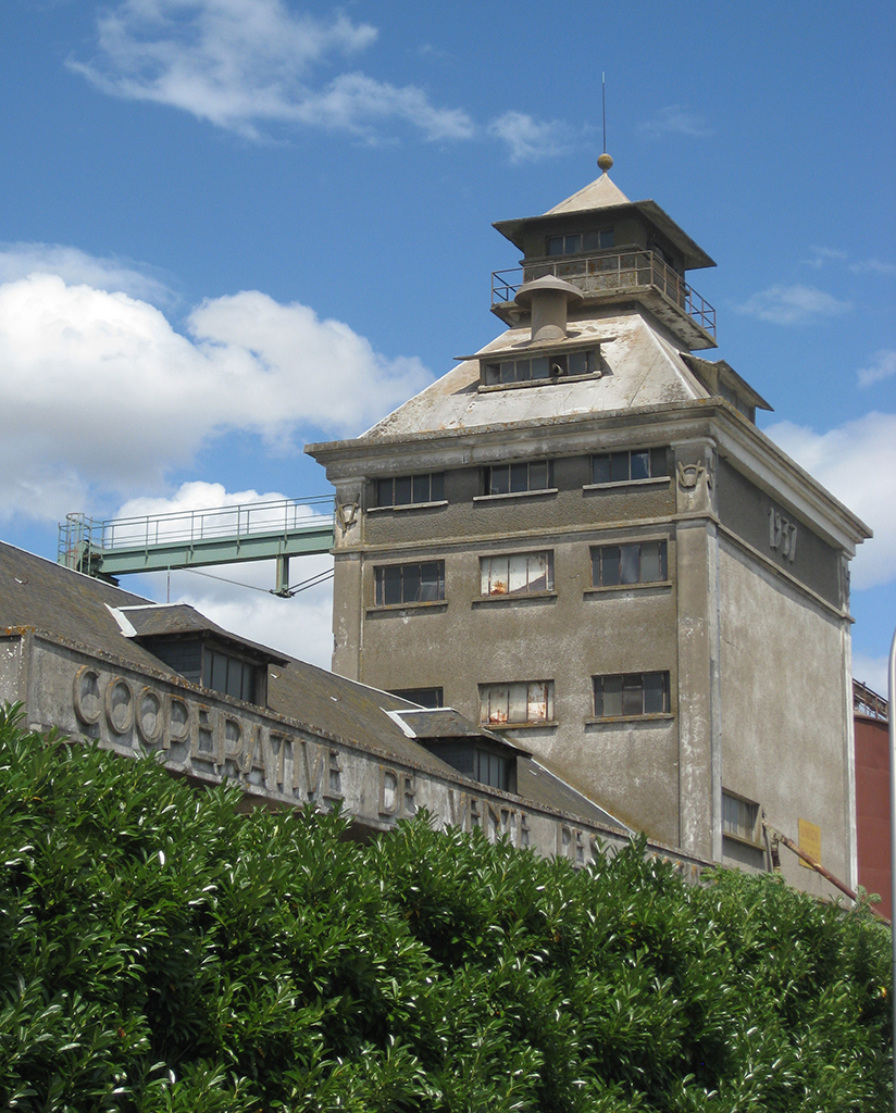 This agricultural cooperative is located in Onzain just across the Loire from château Chaumont. It apparently was constructed in 1937 (that's the date on the front side of the taller building) in an art deco style. It's difficult to get a good angle on this building as it is very long and is partially obscured by this row of tall vegetation. The three red silos on the right also make for an interesting shot against a blue sky, but I'll save that one for another day.